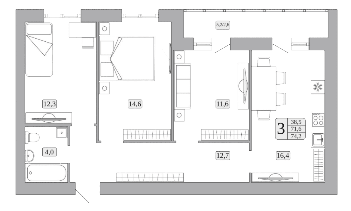 Планировочные решения трехкомнатных квартир в ЖК «Перемена» (А-34) учитывают потребности больших семей, ставя на первое место функциональность. Безусловное преимущество планировки - сопоставимые по размеру комнаты: 11,6, 12,3 и 14,6 кв. м, просторная кухня в 16,4 кв. м, где можно устроить уголок отдыха, и большая лоджия. При метраже в 71,6 и 72,9 кв. м простор и комфорт для всех обеспечен.